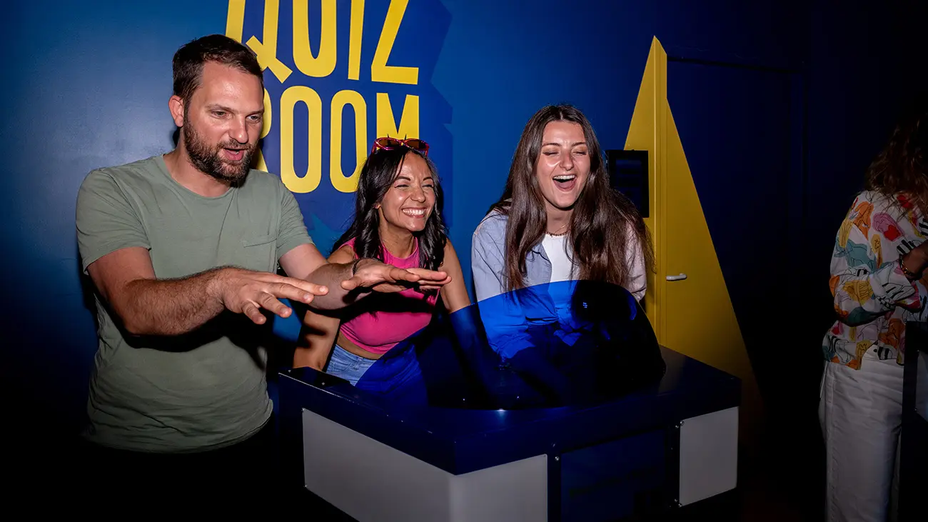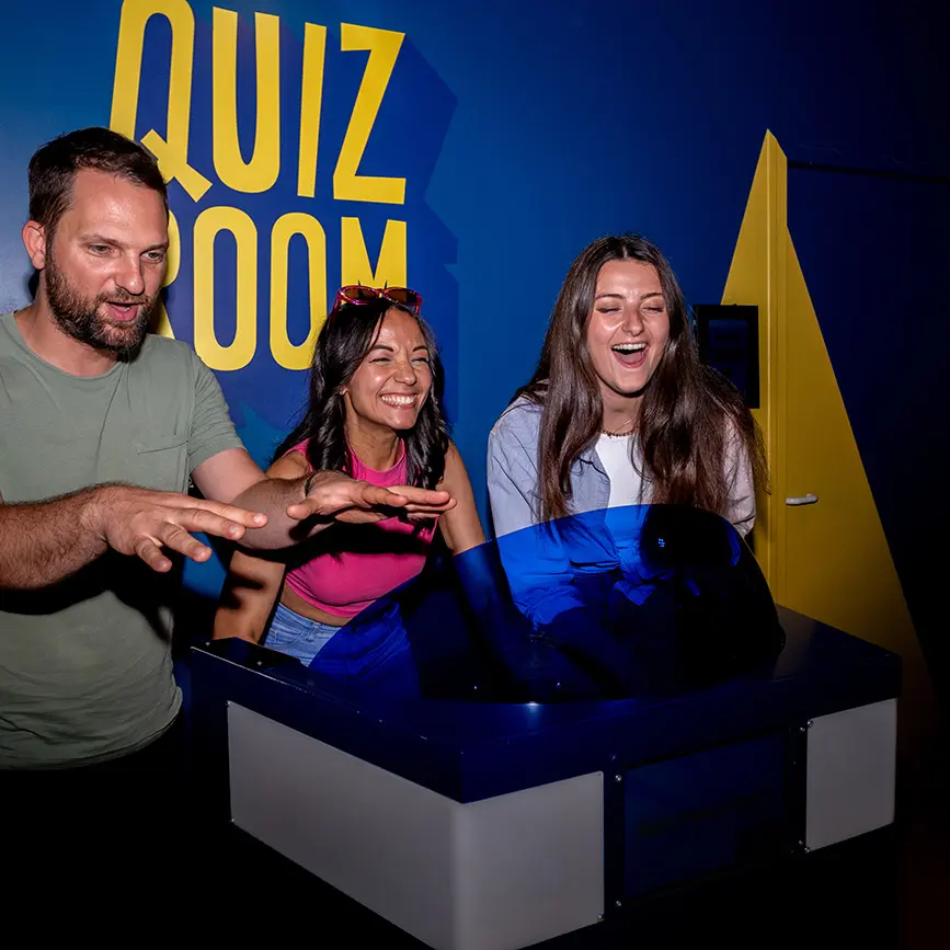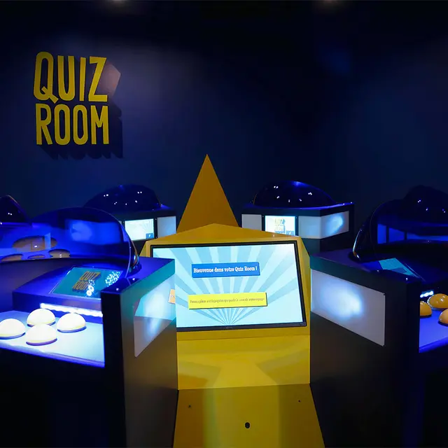 Mit Quiz Room tauchen Sie in die Welt der berühmtesten Fernsehspiele ein. Mit einem Buzzer in der Hand und Licht- und Soundeffekten spielen Sie als Team in einem echten TV-Set. Die Fragen machen Spaß, sind für alle zugänglich und können sogar auf den jeweiligen Anlass zugeschnitten werden (Geburtstag, Junggesellenabschied, Teambuilding...).