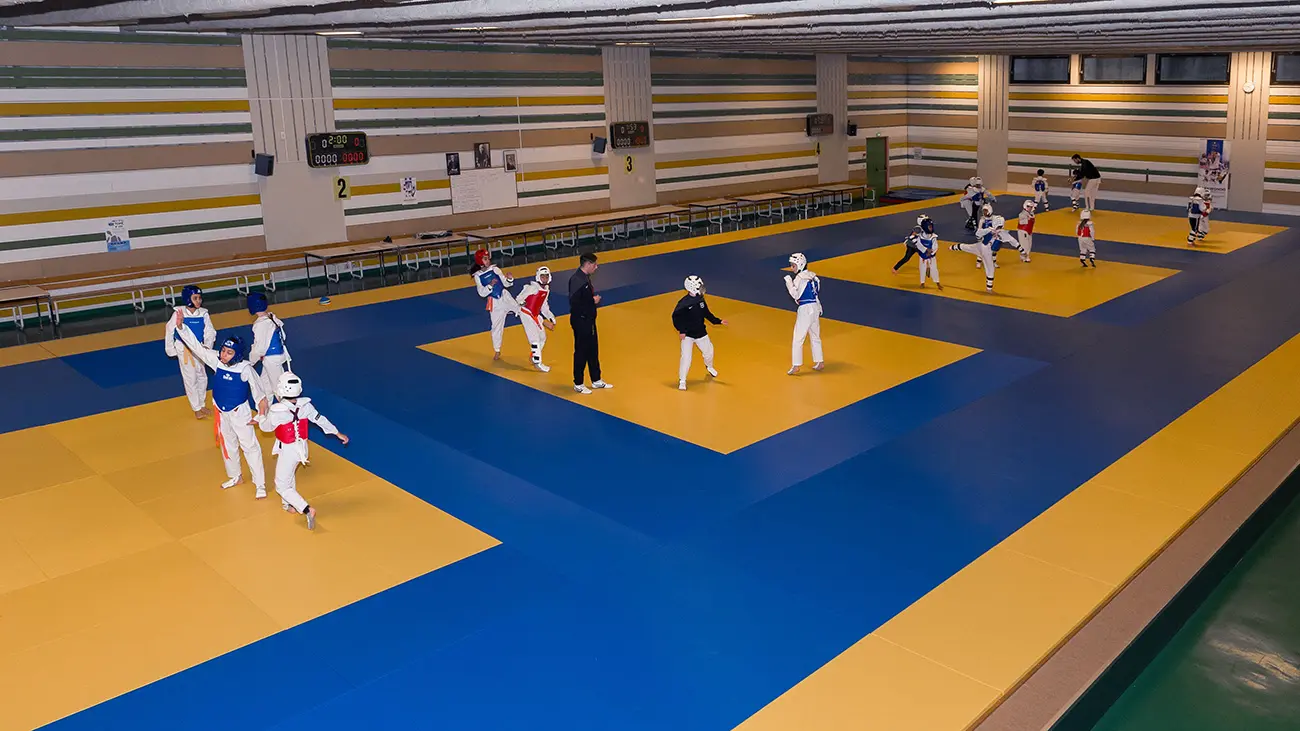 In terms of sports, the complex has the equivalent of 8 sports halls. The multi-sports hall (64 x 44 metres), with three team sports fields and 700 seats in the stands, offers the opportunity to organise major competitions, events and training camps. A specific gymnastics hall, a dojo (40 x 20 metres) with 200 seats in the stands, a boxing/wrestling hall, a fencing/archery hall and a weight room complete the wide range of facilities.