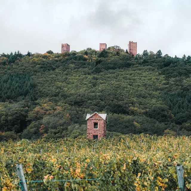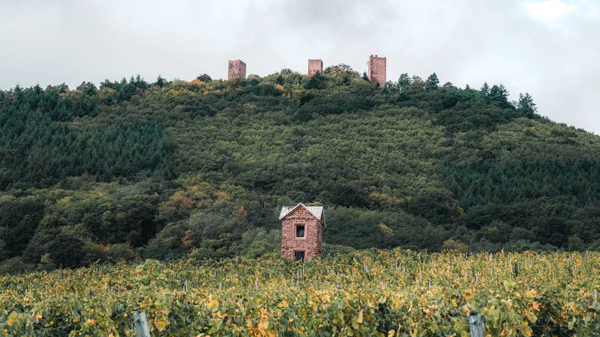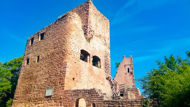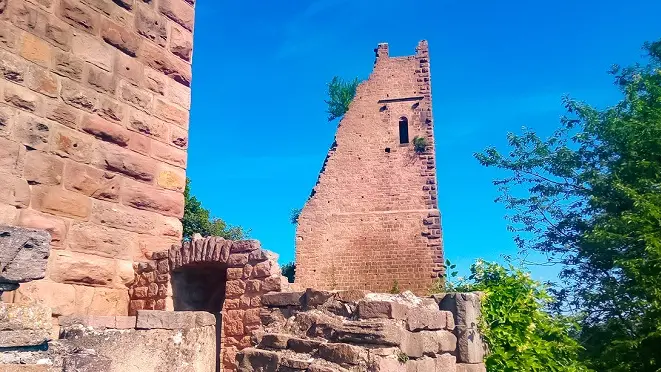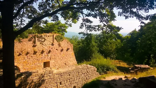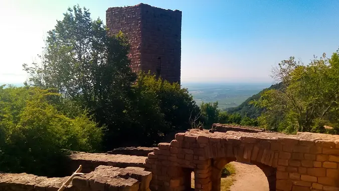 The three dungeons, silhouetted against the Schlossberg hill, dominate the Alsace plain at an altitude of 591m. The three castles were built between the 11th and 12th centuries. In the center is the oldest, the Wahlenbourg, with its seigniorial dwelling, owned by the Count of Eguisheim, Hugues IV. Next came the castle to the north, called the Dagsbourg. The third, called Weckmund, was built in the 12th century. All that remains today are three pink sandstone keeps that once formed a single castle, gradually destroyed and abandoned from the 15th century onwards.