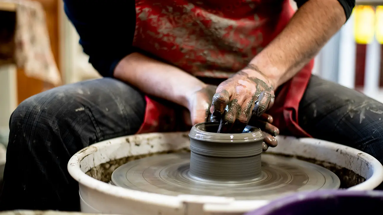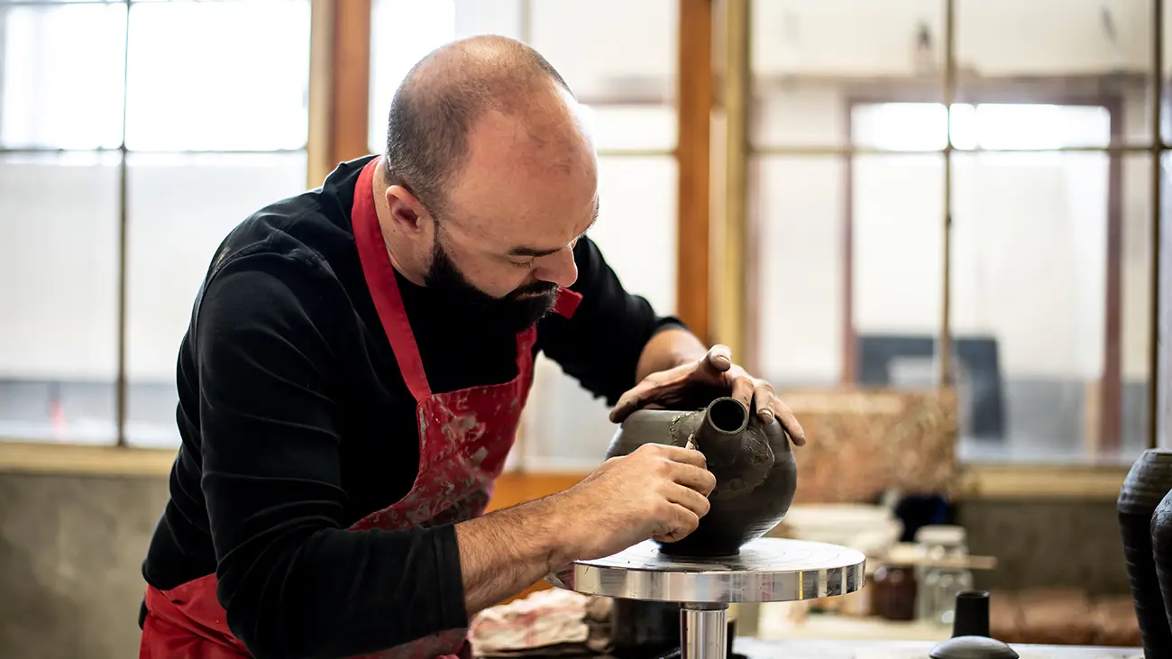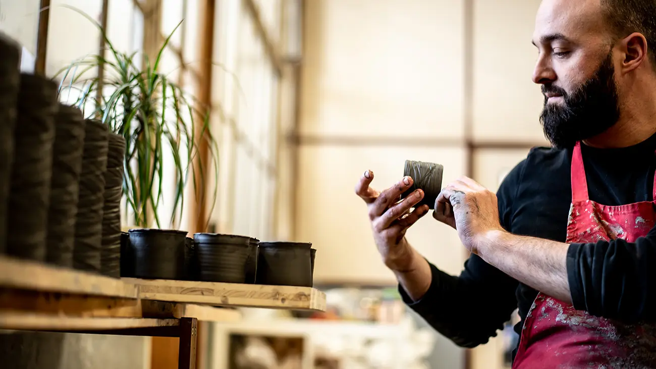Giom Von Birgitta, potier-céramiste, crée avant tout des objets usuels qui s'ancrent aussi bien dans le quotidien que pour des instants d’exception. Tout est réalisé dans son atelier à Motoco à Mulhouse, une friche industrielle reconvertie en résidence d'artistes : le processus de fabrication est maîtrisé, y compris la recherche des émaux, et les matériaux sont sélectionnés avec soin.